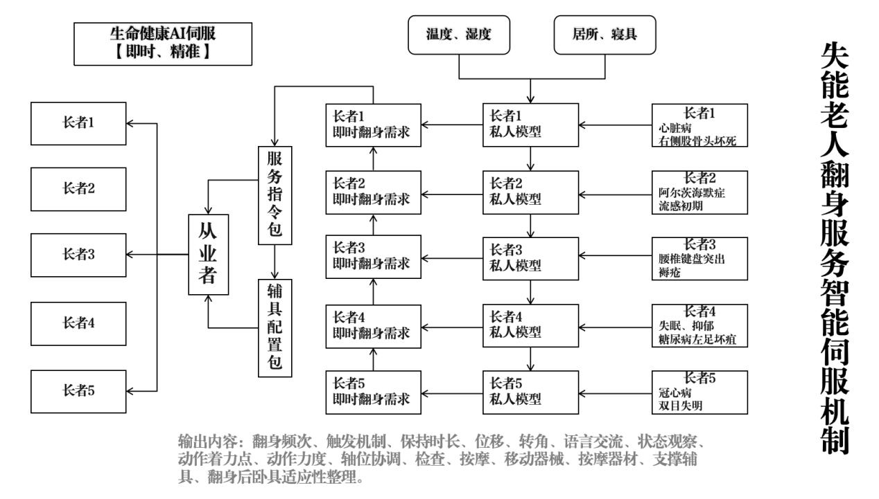 当外因和内因数据输入到我们的大模型和私人模型当中去的时候,我们的系统输出了什么东西?我告诉大家,输出了每个老人此时此刻的精准的翻身方案,每个人是完全不同的。